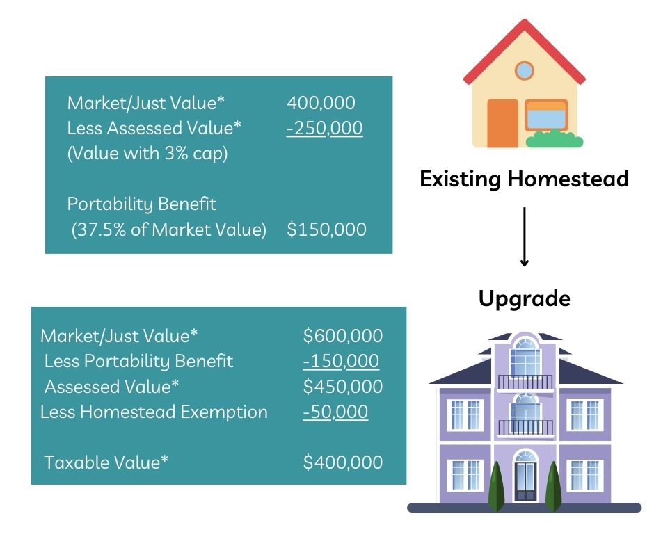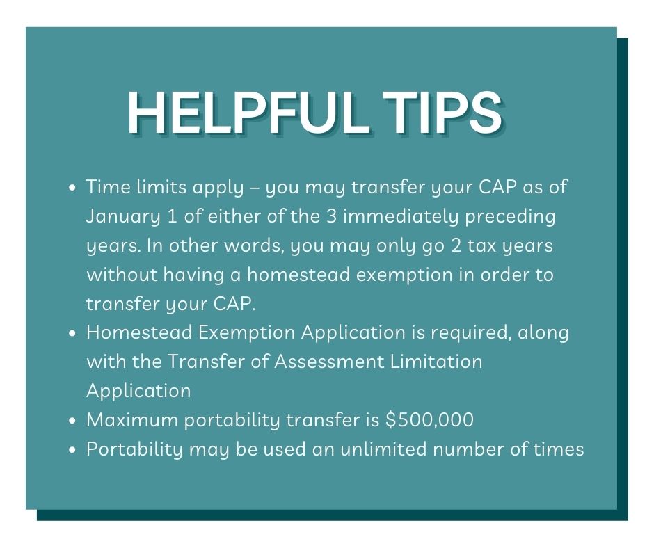 Portability, AKA “Transfer of Homestead Assessment Difference”, is the ability to transfer the dollar benefit of the Homestead CAP from one Homestead to another. Simply put, tax portability allows residents that are moving from one primary residence to another to bring the built-up property tax benefits on the assessed value of their existing home with them to their new home. This can mean up to a $500,000 decrease in the taxable value of your new home and a HUGE annual property tax savings!